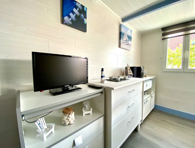 Le studio se compose d'une kitchenette avec plaque de cuisson, mini réfrigérateur avec freezer, un salon ainsi qu'un coin salle à manger grâce à la table relevable, télévision connectée, le coin nuit avec un lit 160x200cm ainsi qu'une commode pour vos affaires.